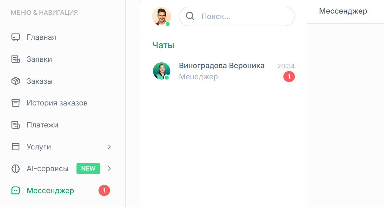 Раздел «Уведомления» предназначен для системных событий (например, изменения по заказам/статусам) и не относится к чатам. Переписка находится только в разделе «Мессенджер».