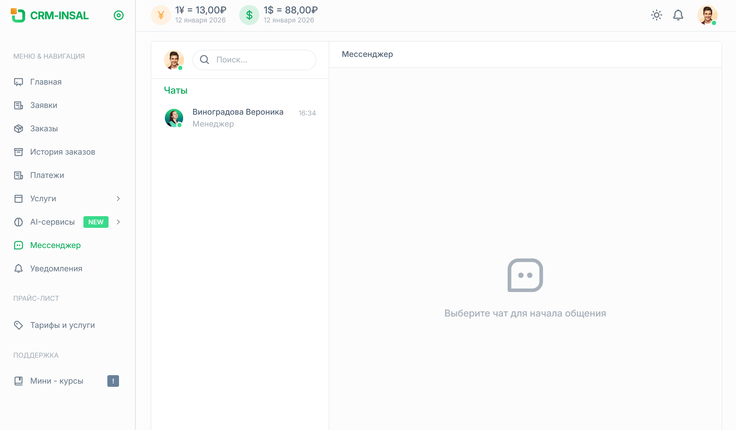 Мессенджер в CRM-INSAL — это встроенный чат для общения с менеджером, уточнения деталей по заказу и обмена файлами/ссылками. Ниже — простая инструкция, как быстро найти нужный диалог и открыть переписку.