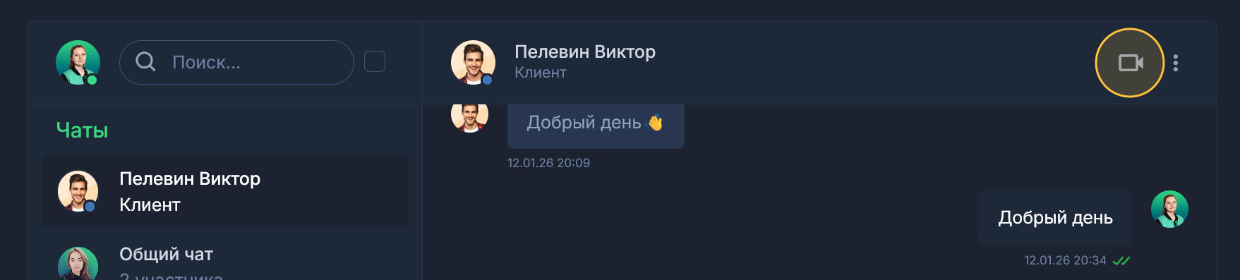 Перед встречей менеджер предупредит вас в чате и сообщит время созвона. После этого в вашем чате станет доступна кнопка видеоконференции.