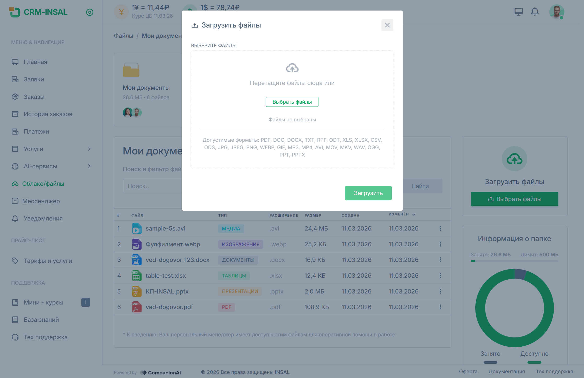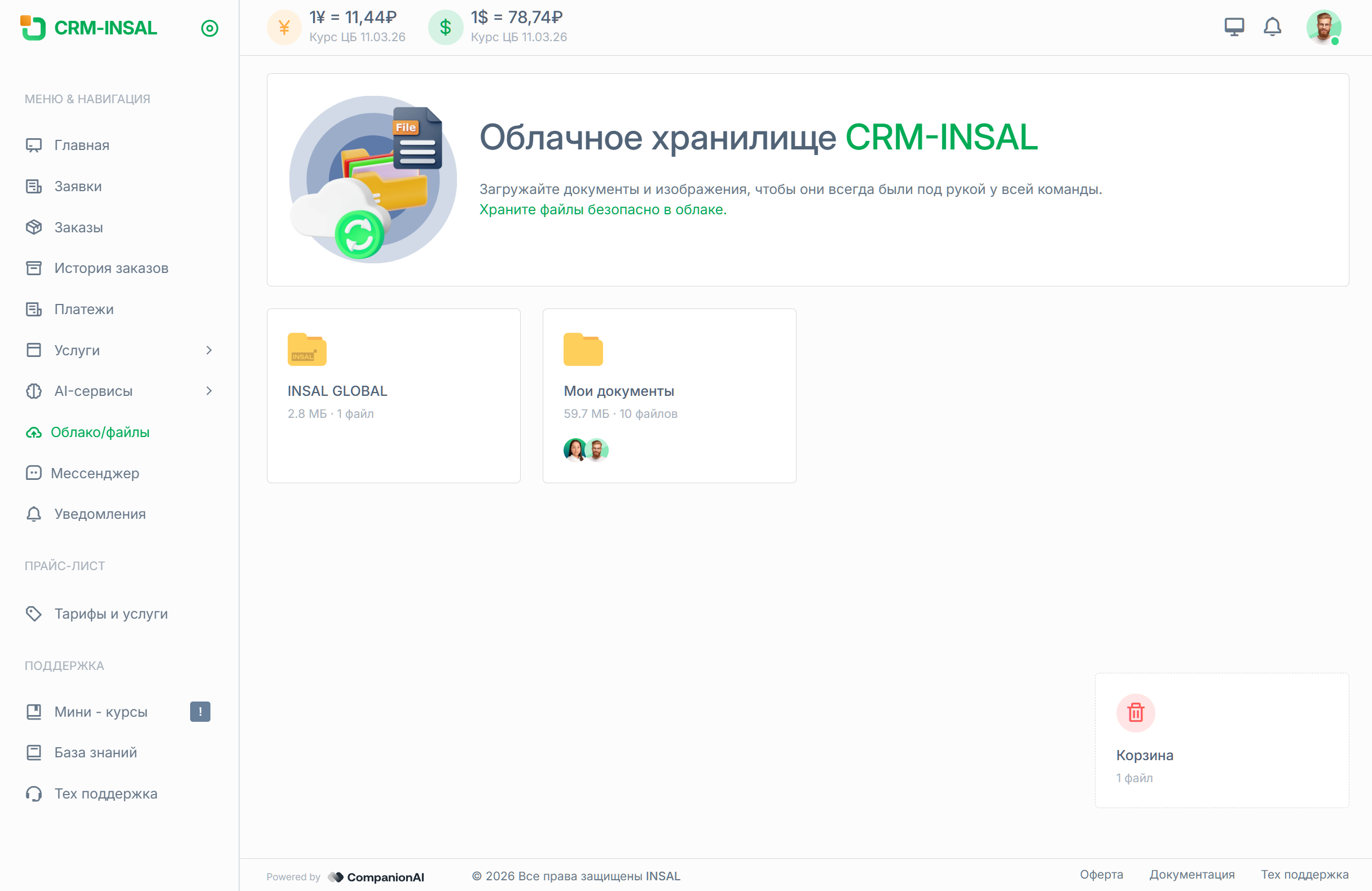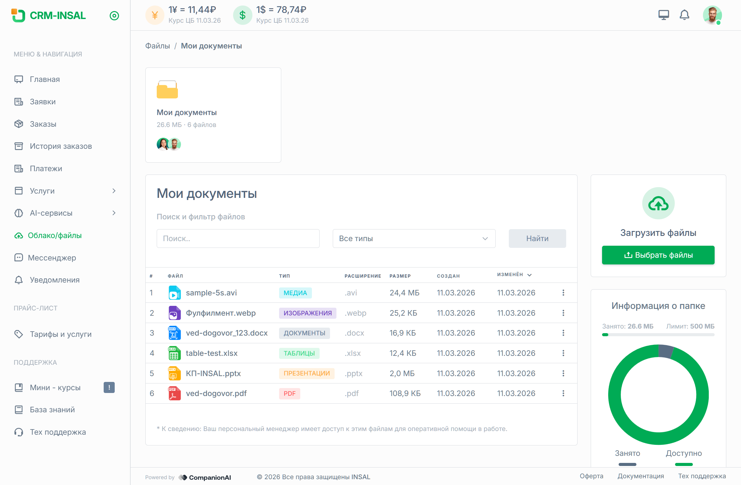 Этот раздел нужен для повседневной работы с файлами по услугам, задачам и взаимодействию с командой INSAL. Вместо пересылки документов по почте и мессенджерам все материалы можно хранить в одном месте внутри CRM.