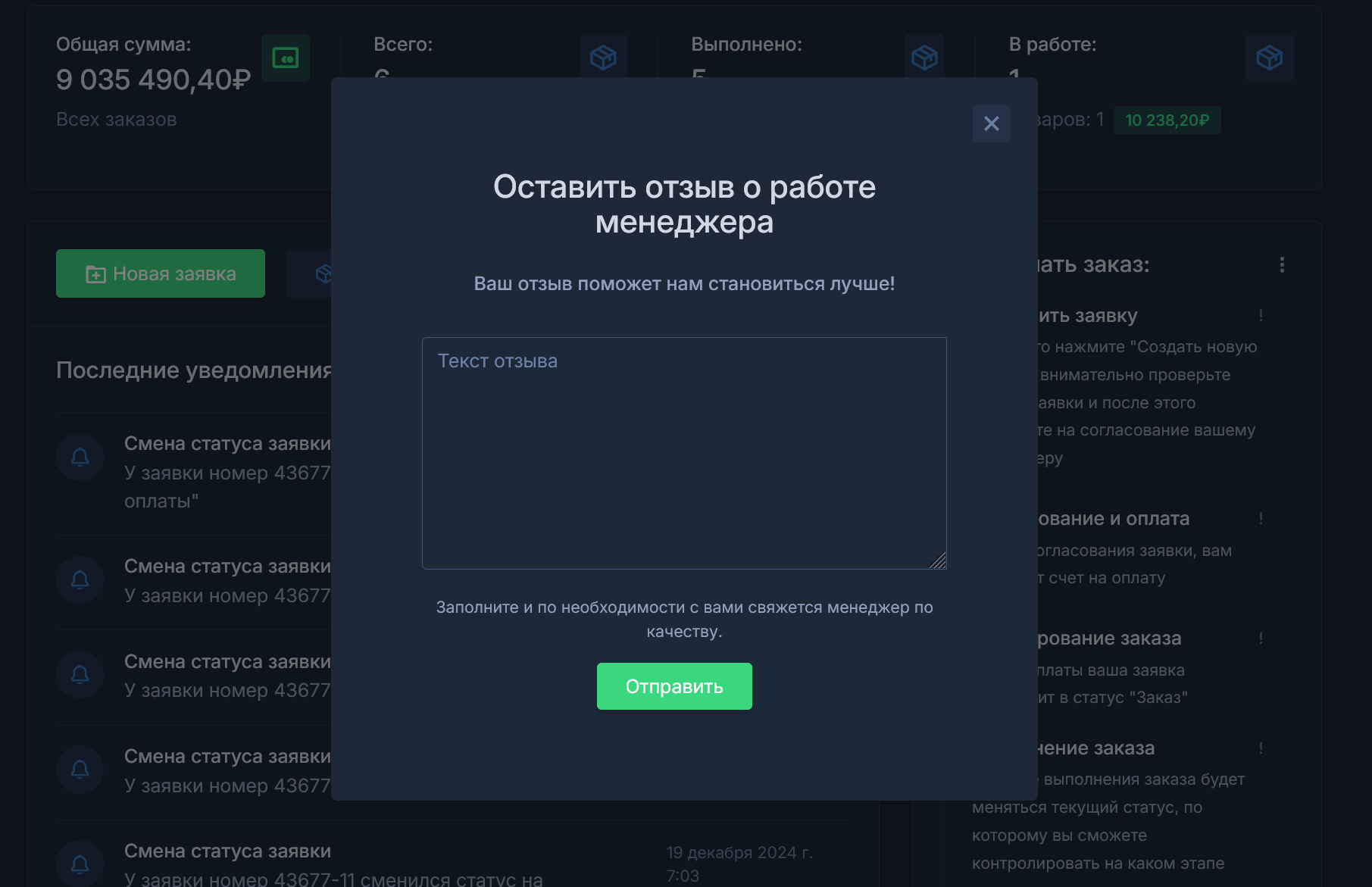 После нажатия появится высплывающее окно, напишите текст отзыва и нажмите кнопку "Отправить"